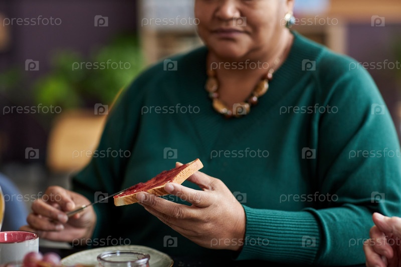Близкий снимок черной старшей женщины, наслаждающейся завтраком и готовящей сэндвич из желе