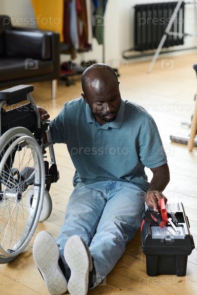 Человек с инвалидностью, ремонтирующий свою коляску