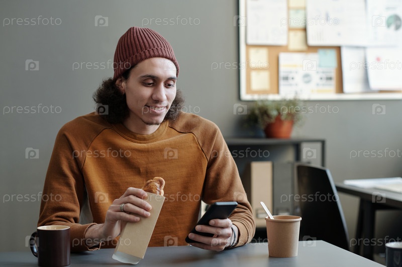 Молодой улыбающийся мультиэтнический мужской сотрудник со смартфоном, имеющий сэндвич
