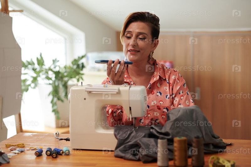 Позитивная швея отвечает на голосовые сообщения от клиента при пошиве платья