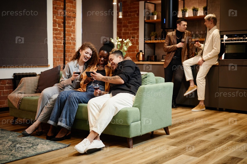 Три счастливых межкультурных девушки смотрят на фотографии в смартфоне на диване