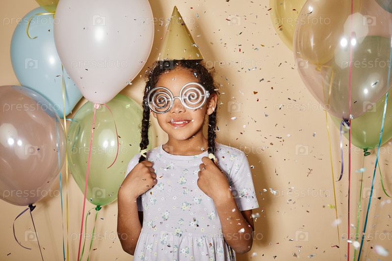 Маленькая черная девочка с воздушными шарами, носящая фанки-очки на вечеринке