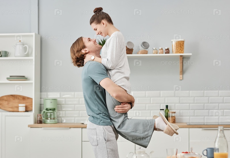 Игральная молодая пара обнимается на кухне и весело проводит время