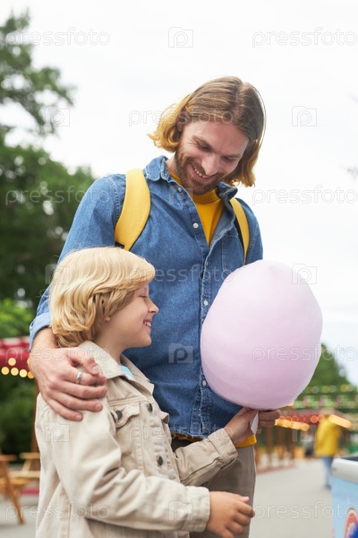 Счастливый отец покупает хлопковую конфету для маленького мальчика