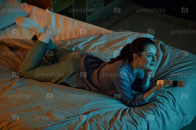 Высокоугольная взрослая женщина смотрит телевизор в темноте, лежа на кровати дома