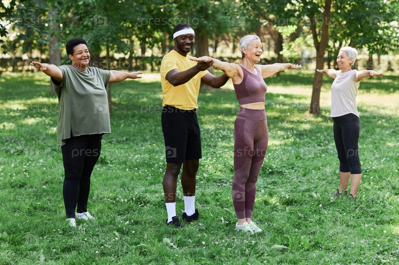Улыбающийся тренер помогает пожилым женщинам, работающим на открытом воздухе в парке