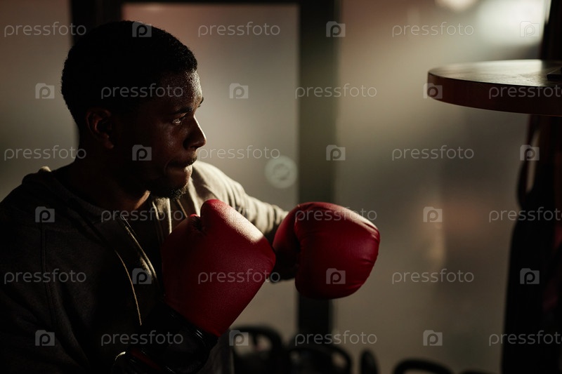 Боковой вид афроамериканского парня в красных боксерских перчатках, бьющего песочный мешок