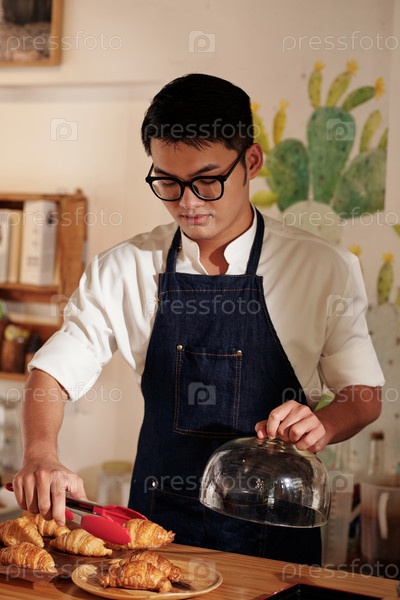 Официант ставит свежие кроассанты на тарелку