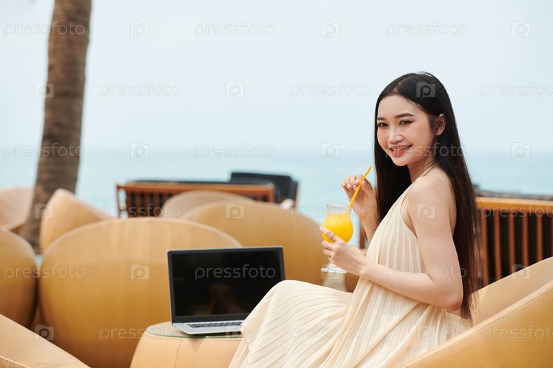 Женщина пьет сок перед онлайн-встречей