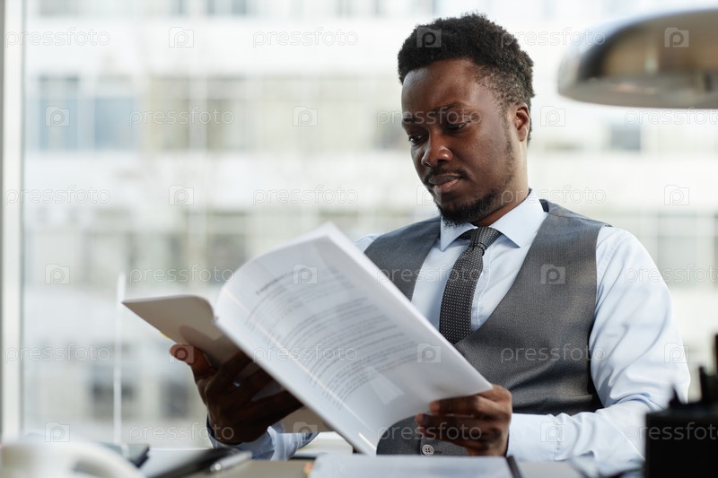Профессиональный чернокожий бизнесмен читает документы за столом в офисе