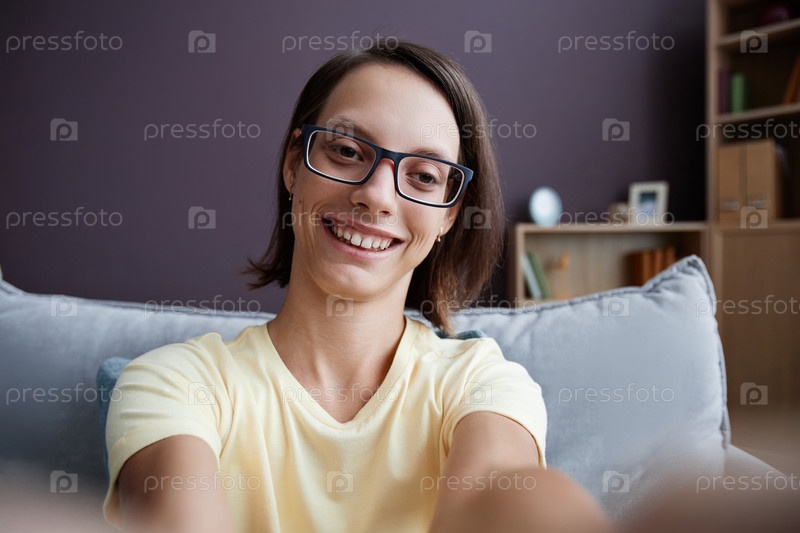 POV улыбающаяся девочка-подросток с инвалидностью делает селфи