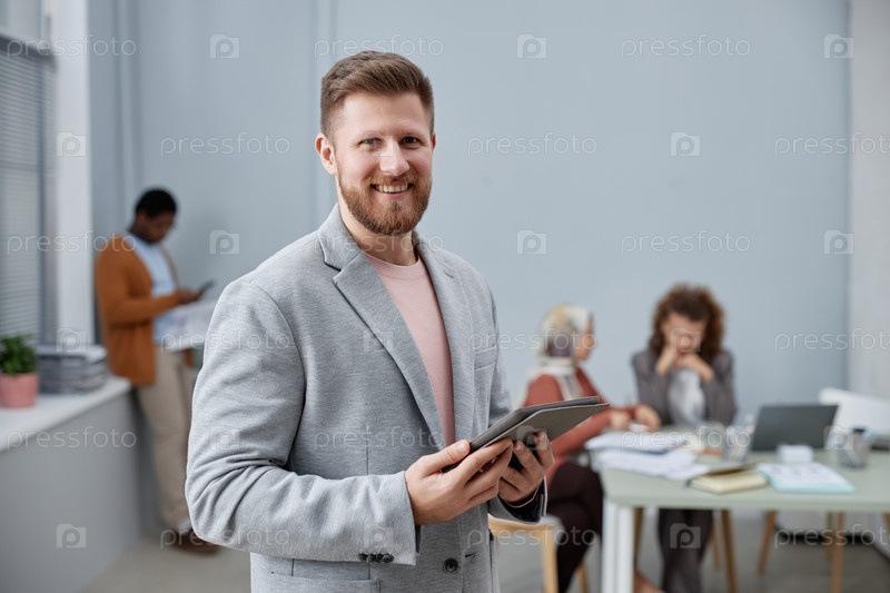 Счастливый молодой исполнительный директор в элегантном сером костюме, держащий планшет