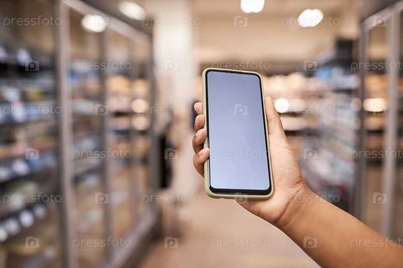 Женская рука, держащая смартфон с макетом белого экрана в интерьере супермаркета