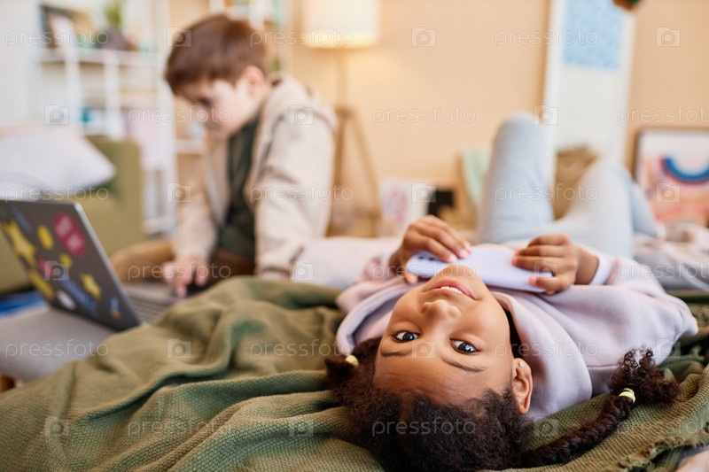 Портрет чернокожей девушки, смотрящей на камеру вверх ногами