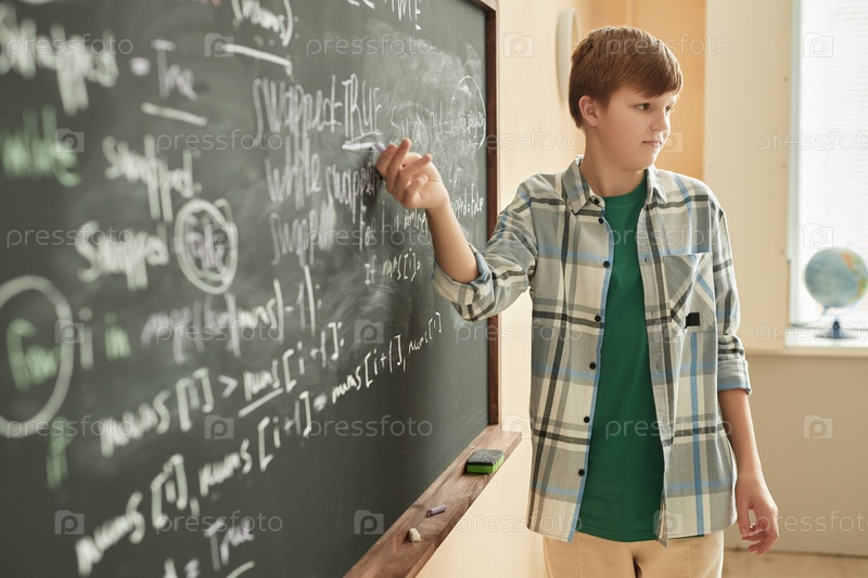 Боковый вид подросткового школьника, отвечающего в классе на доске