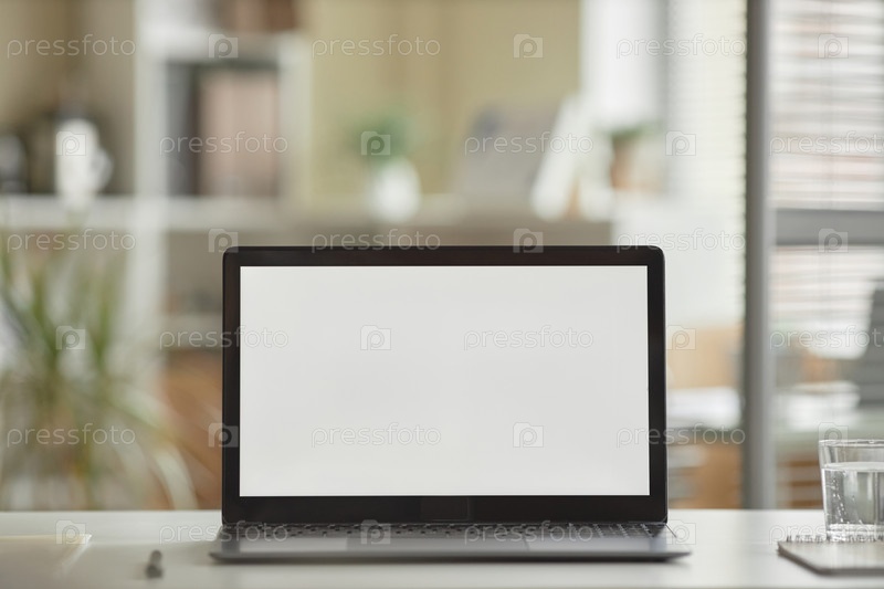 Клюшовый снимок открытого ноутбука с пустым белым экраном макет на столе в офисе