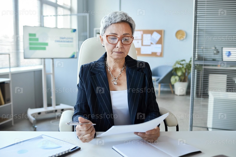 Босс-женщина сидит на рабочем месте в офисе и читает документ