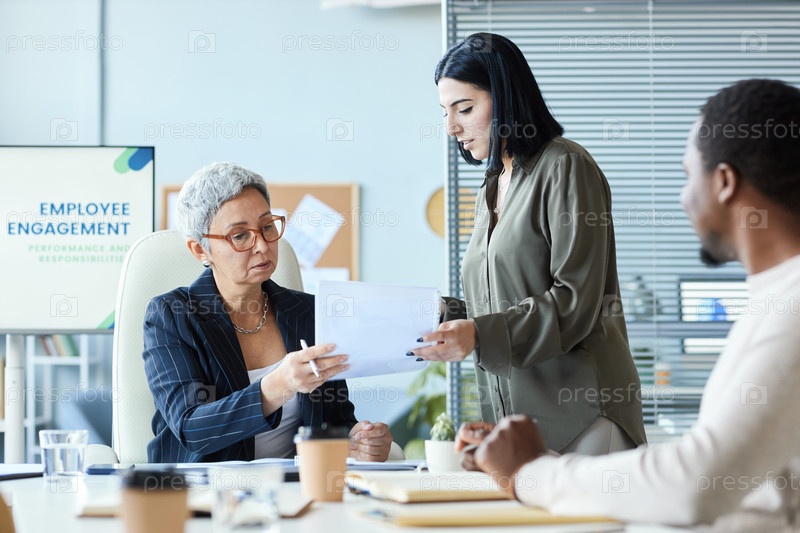 Старший босс-женщина подписывает документ на деловой встрече с командой