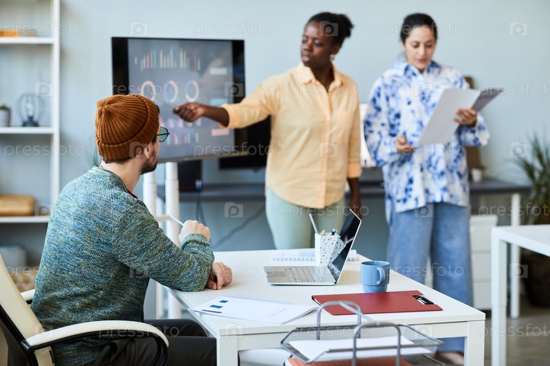Молодой бизнесмен сидит за столом с ноутбуком и слушает тренера