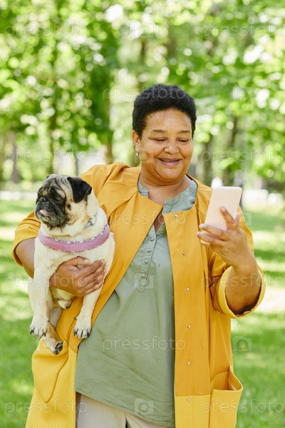 Женщина делает селфи с собакой в парке