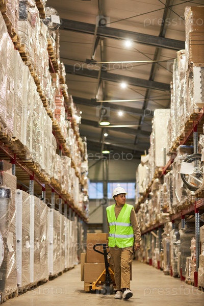 Работница, несущая боксера на складе и идущая к камере