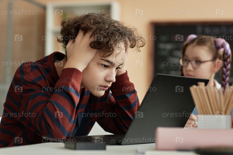 Боковой вид школьник-подросток, использующий компьютер в школе для онлайн экзамена