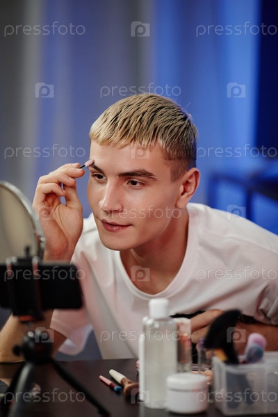 Учебное пособие по макияжу молодого человека, снимающего фильмы в студии