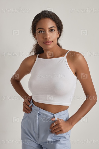 Черная женщина позирует на белом