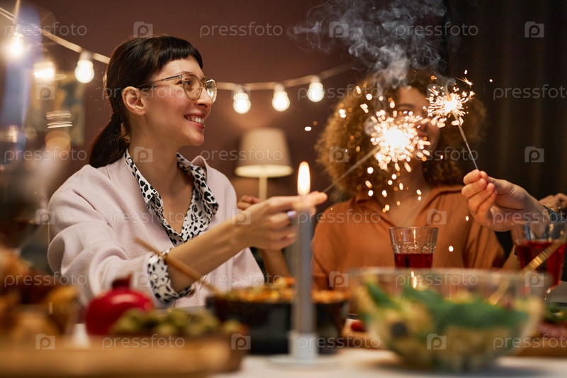 Счастливая брюнетка в очках, держащая блестящий бенгальский свет