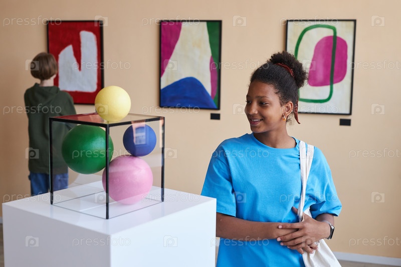 Улыбающаяся девочка-подросток смотрит на абстрактную скульптуру в музее