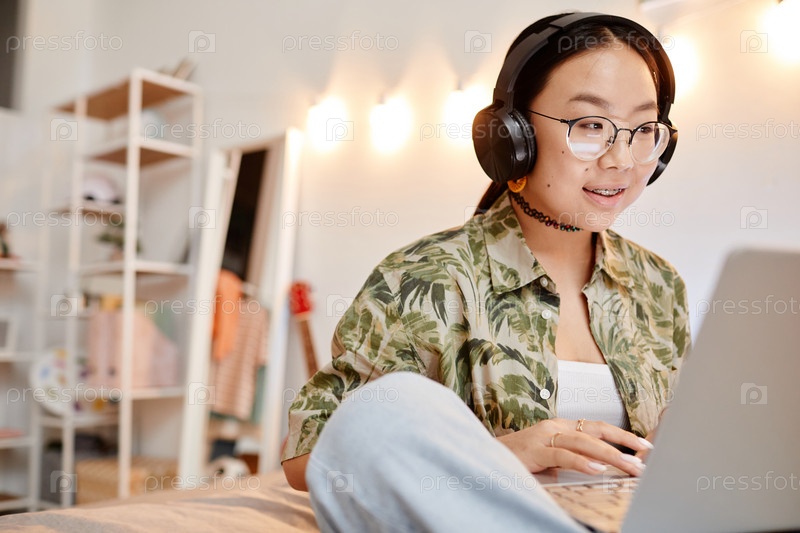 Подростковая азиатская девушка, использующая ноутбук в постели