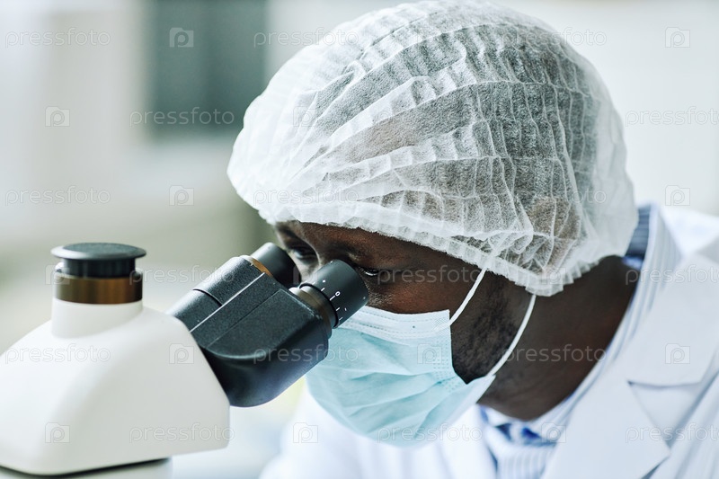 Чернокожий ученый смотрит в микроскоп, работая над исследованием в лаборатории
