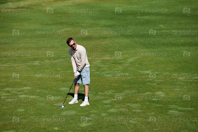 Богатый человек играет в гольф на зеленом поле под солнцем
