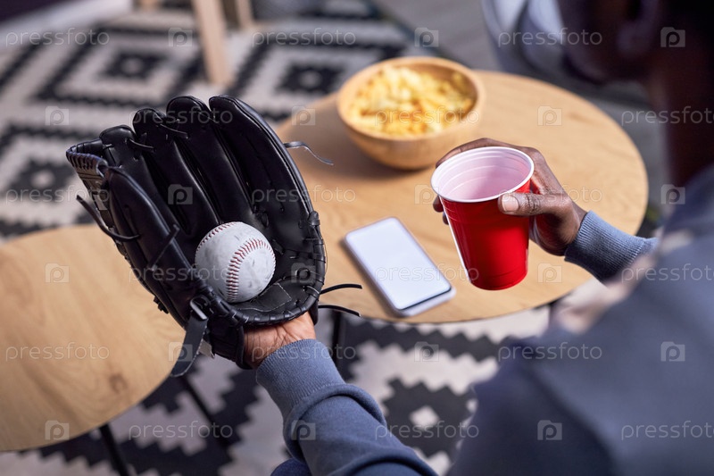 Близкий снимок фаната спорта, носящего бейсбольную перчатку во время просмотра матча дома