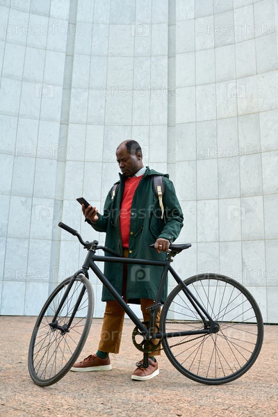 Бизнесмен с велосипедом, использующий свой смартфон на открытом воздухе
