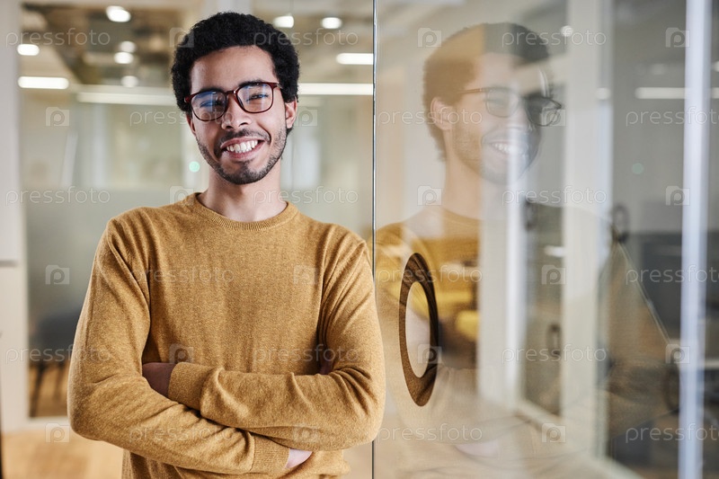 Молодой арабский мужчина носит очки в офисе и улыбается перед камерой