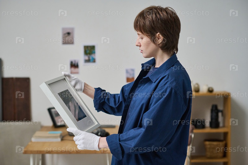 Фотограф смотрит на обрамленную фотографию