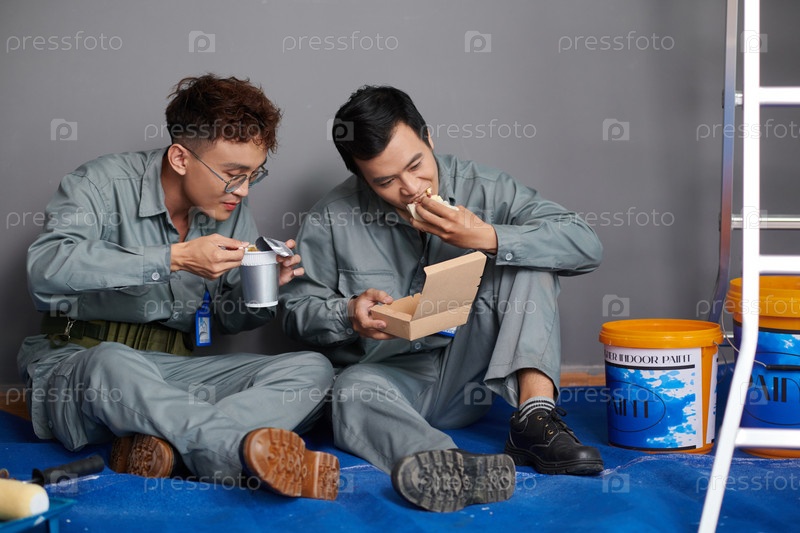 Работники обедают после покраски стен в доме клиента