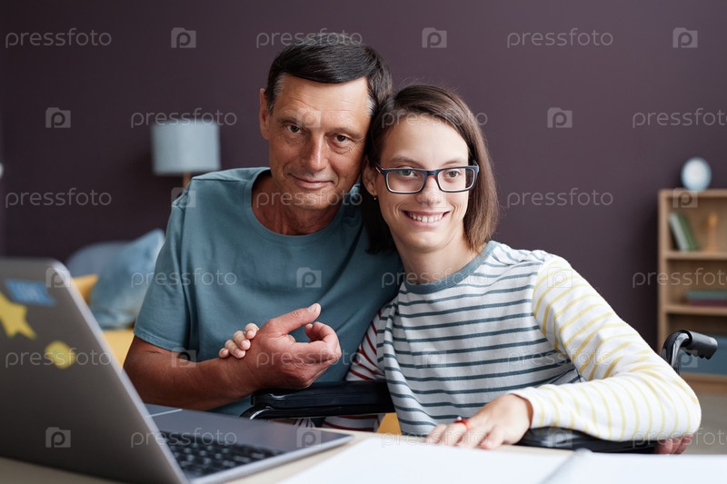 Улыбающаяся девочка-подросток с инвалидностью позирует со своим отцом дома и использует ноутбук