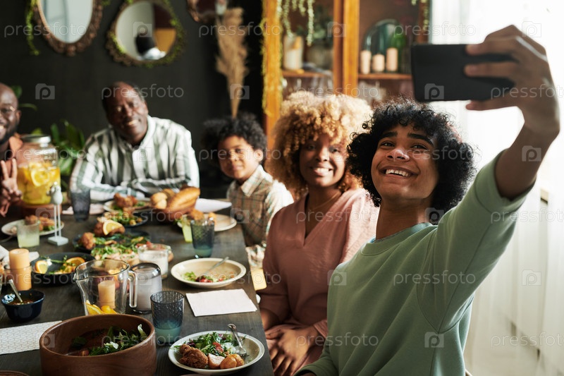 Семья делает селфи-портрет на смартфоне