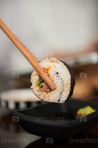 Человек, погружающий суши в соевый соус