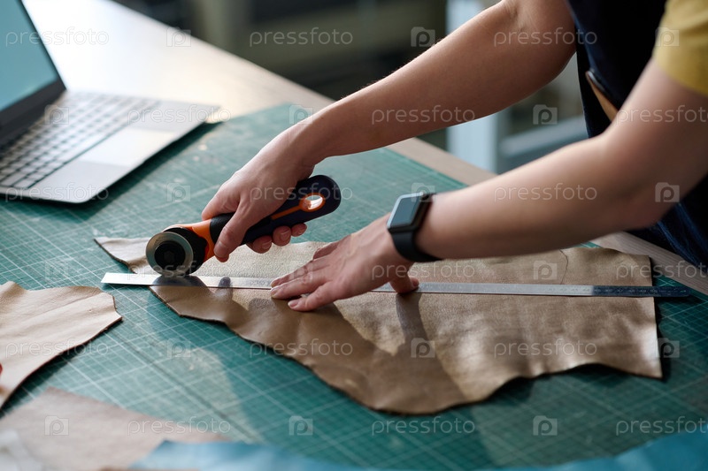 Руки молодой женской портной, режущей кусок бежевой кожи