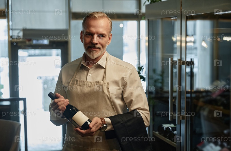 Зрелый официант с бутылкой красного вина
