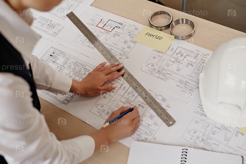 Инженерка рисует чертежи и планы на рабочей станции в офисе