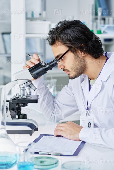 Серьезный врач, изучающий бактерии или новый вирус под микроскопом в лаборатории