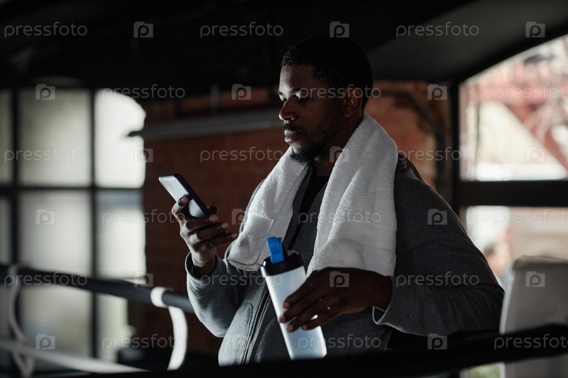 Молодой афроамериканский спортсмен с белым полотенцем на шее использует смартфон