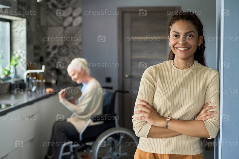 Молодая веселая мультиэтническая девочка-подросток смотрит на камеру в кухне
