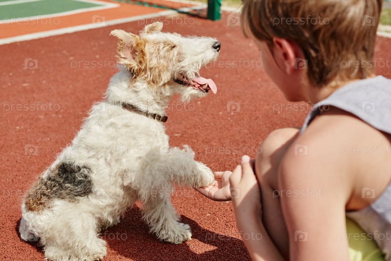 Мальчик играет со своей милой собачкой на солнце и дарит лапы
