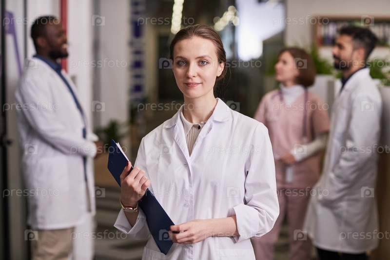 Молодая успешная женщина-генеральный практик в лабораторном пальто, держащий документ