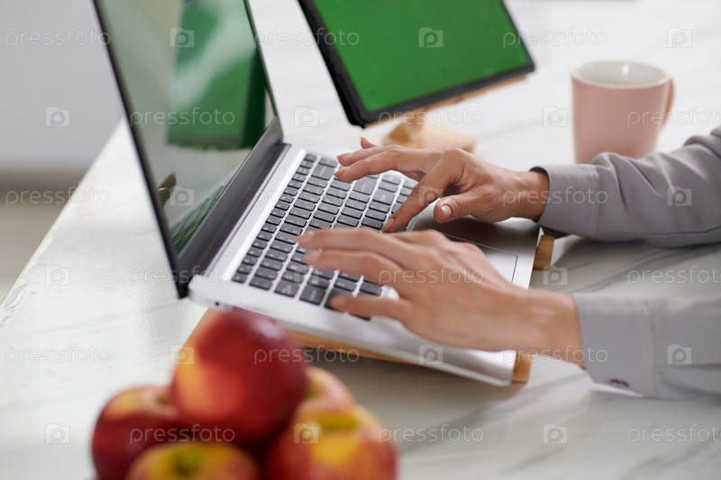 Боковой вид рук молодого веб-дизайнера, нажимающего клавиши клавиатуры ноутбука